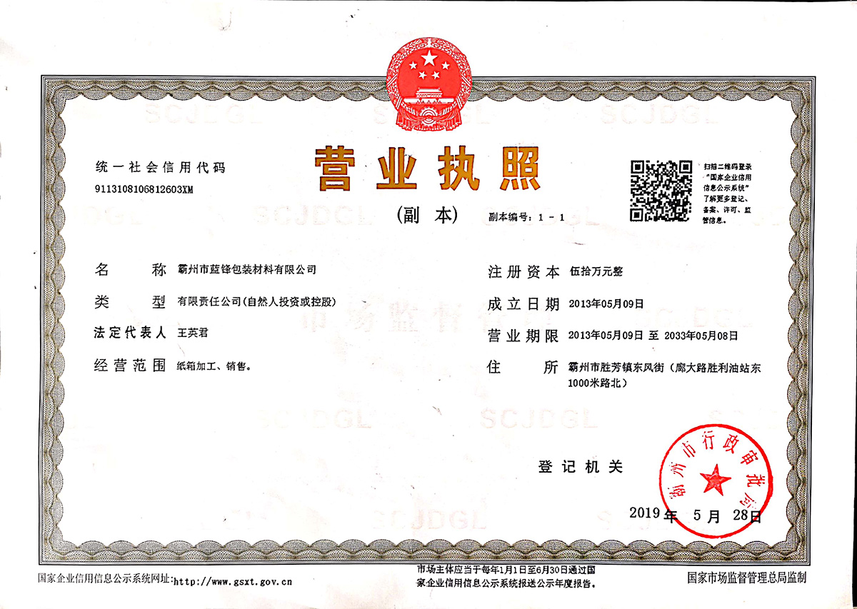 立即咨詢霸州市藍鋒包裝材料有限公司,前身為成立于1988年的勝芳鎮藍劍紙箱廠。是河北省較早涉足紙包裝制品的民營企業。經過近三十年的發展,公司已經由起初的家庭作坊發展為現有標準化廠房8000平米,員工50人,其中管理人員7名;年產紙箱上億平米的現代化企業。